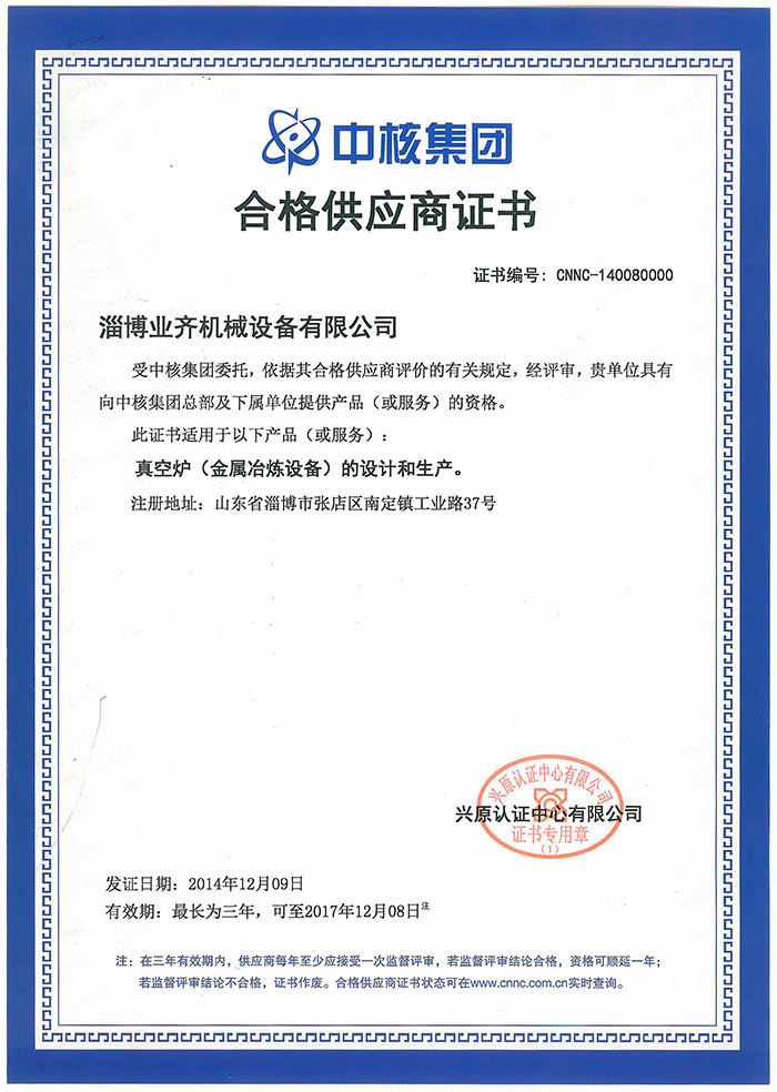 歲末年初,宿迁金庆化工制造集团(3G网站)全(quan)體員工迎來(lái)喜訊,經過四(sì)年多愉快而(ér)成功的合作(zuo)之旅,以及近(jìn)半年的嚴格(gé)評價、審核、認(ren)證,業齊機械(xie)順利取得中(zhong)國核工業集(jí)團的合格供(gong)應商證書。這(zhè)标志着以2015新(xīn)的一年爲起(qi)點,淄博業齊(qi)機械與中國(guo)核工業集團(tuan)在真空爐非(fei)标設計、研發(fa)、生産領域将(jiang)邁入更深入(rù)、更緊密的合(he)作!